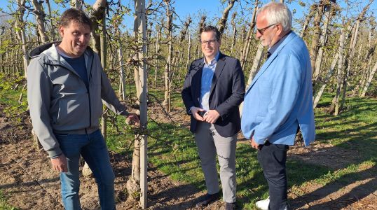 Tweede Kamerleden Harm Holman van Nieuw Sociaal Contract en Pieter Grinwis van ChristenUnie hebben maandag 7 april een bezoek gebracht aan de fruitsector in Regio FruitDelta Rivierenland. Bert den Haan en Mireille Gijsberts ontvingen de Kamerleden op hun bedrijf in Kerk-Avezaath. Samen met NFO-kringvoorzitter Erik van Haarlem gingen ze met de Kamerleden in gesprek over de belangrijke thema’s die in de sector spelen: water, arbeid en gewasbescherming. “Het was een plezierig gesprek en goed om hen uitleg te geven over wat er speelt in de fruitsector. We hebben het gehad over de knelpunten op het gebied van arbeid. Onze concurrentiepositie ten opzichte van België en Duitsland staat op het spel vanwege de hoge werkgeverslasten. Ook op gebied van gewasbescherming is onze concurrentiepositie in het geding, importproduct concurreert in de schappen met ons product, dat aan strengere eisen moet voldoen.”