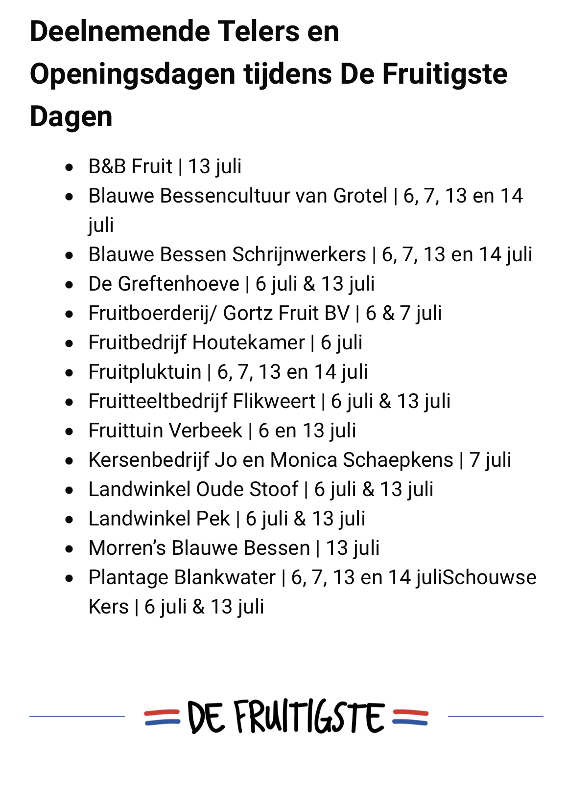 Voor meer informatie over de telers en het programma van de Fruitigste KleinFruitdagen, kun je terecht op defruitigste.nl. Hier vind je een overzicht van alle deelnemende telers en hun locaties, evenals praktische informatie zoals openingstijden en speciale activiteiten.