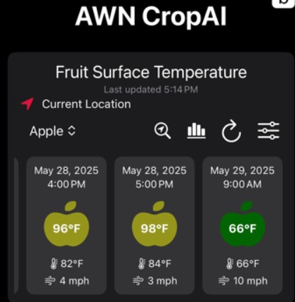 Om telers te ondersteunen bij het nemen van maatregelen tegen zonnebrand heeft AgWeatherNet een app (AWN CropAI) ontwikkeld. De app biedt weersafhankelijke voorspellingen per uur van de schiltemperatuur op basis van de locatie van de gebruiker en een nabijgelegen AgWeatherNet-station. Met hulp van voorspellingen kunnen telers inspelen op de hittestress door de timing van irrigatie, schaduwinzet of verdampingskoeling te optimaliseren.