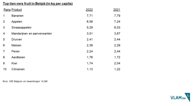 De meest gekochte fruitsoort was ook in 2022 banaan met 7,71 kg per Belg. De verkopen van appel daalden met 9% meer dan gemiddeld. Jonagold is met een aandeel van 40% het meest verkocht appelras. Ook de perenverkoop daalde met 8%. Conference blijft met ruim driekwart van de perenverkoop veruit het belangrijkste ras. Buiten de top 10 deden vooral frambozen (+10%), kersen (+8%) en avocado (+7%) het goed.