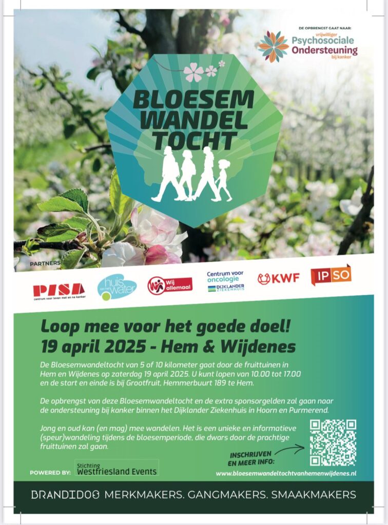 Zes fruittelers in Hem en Wijdenes openen aanstaande zaterdag, 19 april, hun bedrijven voor het grote publiek, tijdens een speciale Bloesemwandeltocht. Daarmee willen ze laten zien hoe de fruitsector een mooi en gezond product teelt én geld ophalen voor de psychosociale ondersteuning van kankerpatiënten. Ruim 1000 wandelaars hebben zich ingeschreven.