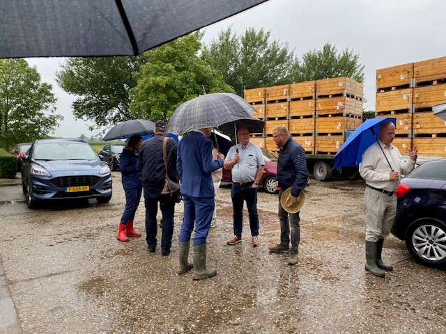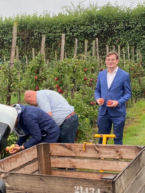 Een delegatie burgermeesters uit Noord- en Zuid-Beveland trapte afgelopen dinsdag de hardfruitoogst in de Bevelandse gemeenten af. Dit gebeurde op het bedrijf van de familie Slootweg in Waarde, waar zowel appels als peren worden geteeld. Ook de NFO was vertegenwoordigd, in de personen van Rinus van ’t Westeinde en Ron Mulders.