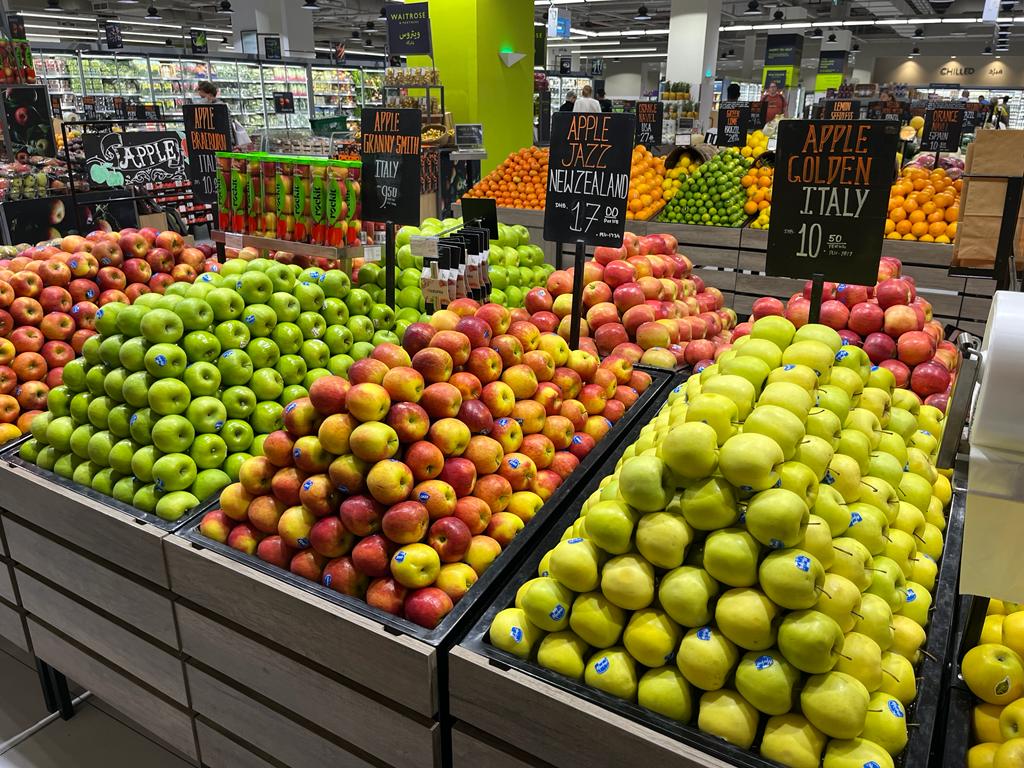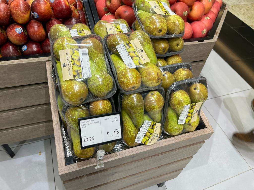 Altijd leuk, om het fruitschap in buitenlandse supermarkten onder de loep te nemen. Eén van onze redactieleden was recent in Dubai en maakte daar wat mooie foto’s van de fruitafdelingen in supermarkten. Alle producten liggen hier mooi strak opgestapeld en worden met een luxe uitstraling gepresenteerd. Helaas was er weinig Nederlands fruit te bekennen, op enkele Conference-peren na. Een schaaltje met vier Conference-peren werd verkocht voor bijna 5,20 euro.