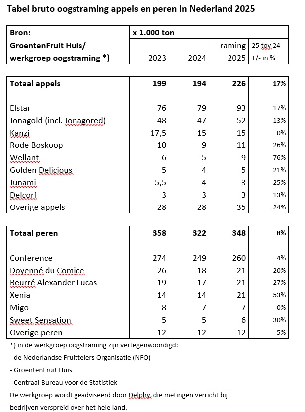 Zoetermeer 28 juli 2025 – De Nederlandse oogst van appels zal dit jaar naar verwachting 17 procent hoger zijn dan vorig jaar. Ook de perenoogst stijgt, met een toename van 8 procent ten opzichte van vorig jaar. De oogstraming komt uit op 226 miljoen kilo appels en 348 miljoen kilo peren. Dit blijkt uit gegevens van GroentenFruit Huis en de Nederlandse Fruittelers Organisatie (NFO) op basis van de werkgroep Oogstraming.
