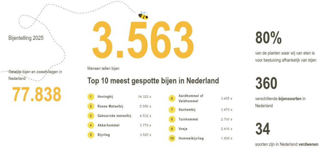 Tijdens de Nationale Bijentelling, in het weekend van 19 en 20 april, hebben 3.500 tellers bijna 80.000 bijen gesteld. De honingbij werd het vaakst geteld, gevolgd door de rosse en gehoornde metselbij. Hommels werden juist minder vaak geteld.