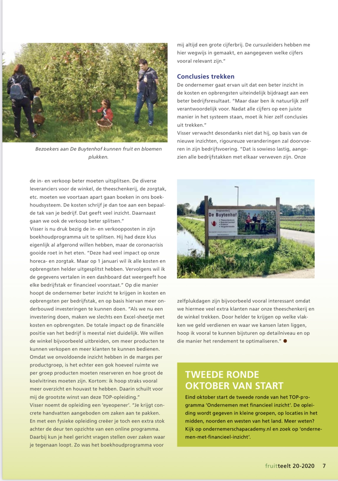 Tijdens de workshop kregen de dames een rondleiding over het bedrijf van Wiard Visser, dat dit jaar twintig jaar bestaat. Het bedrijf is een multifunctioneel bedrijf met naast fruitteelt onder andere een zorgtak, een winkel en een horecagelegenheid. Opvallend was dat de volledige oogst van hardfruit door vrijwilligers wordt uitgevoerd. In totaal zijn er 120 vrijwilligers betrokken, waarvan er 70 wekelijks actief zijn. Enkele jaren geleden verscheen in het vakblad Fruitteelt een artikel over dit bijzondere bedrijf. Dit kunt u teruglezen via deze links: Pagina 1 en Pagina 2.