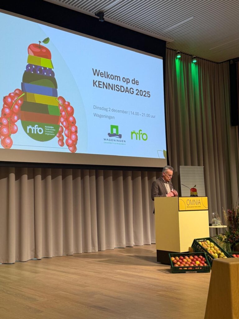Met ruim 250 aanwezigen op de campus van WUR stond de Kennisdag 2025, georganiseerd door NFO samen met WUR en partners (supporters), volledig in het teken van ‘Vizier naar buiten’. Niet alleen als motto, maar als mentaliteit die door vrijwel elke lezing en discussie heen klonk. De fruitteelt staat voor kansen én druk, voor innovatie én maatschappelijke vragen. Om verder te komen, zo bleek uit alle bijdragen, moet de sector nadrukkelijker naar buiten kijken: naar beleid, naar de samenleving, naar ketenpartners, naar techniek en naar elkaar.