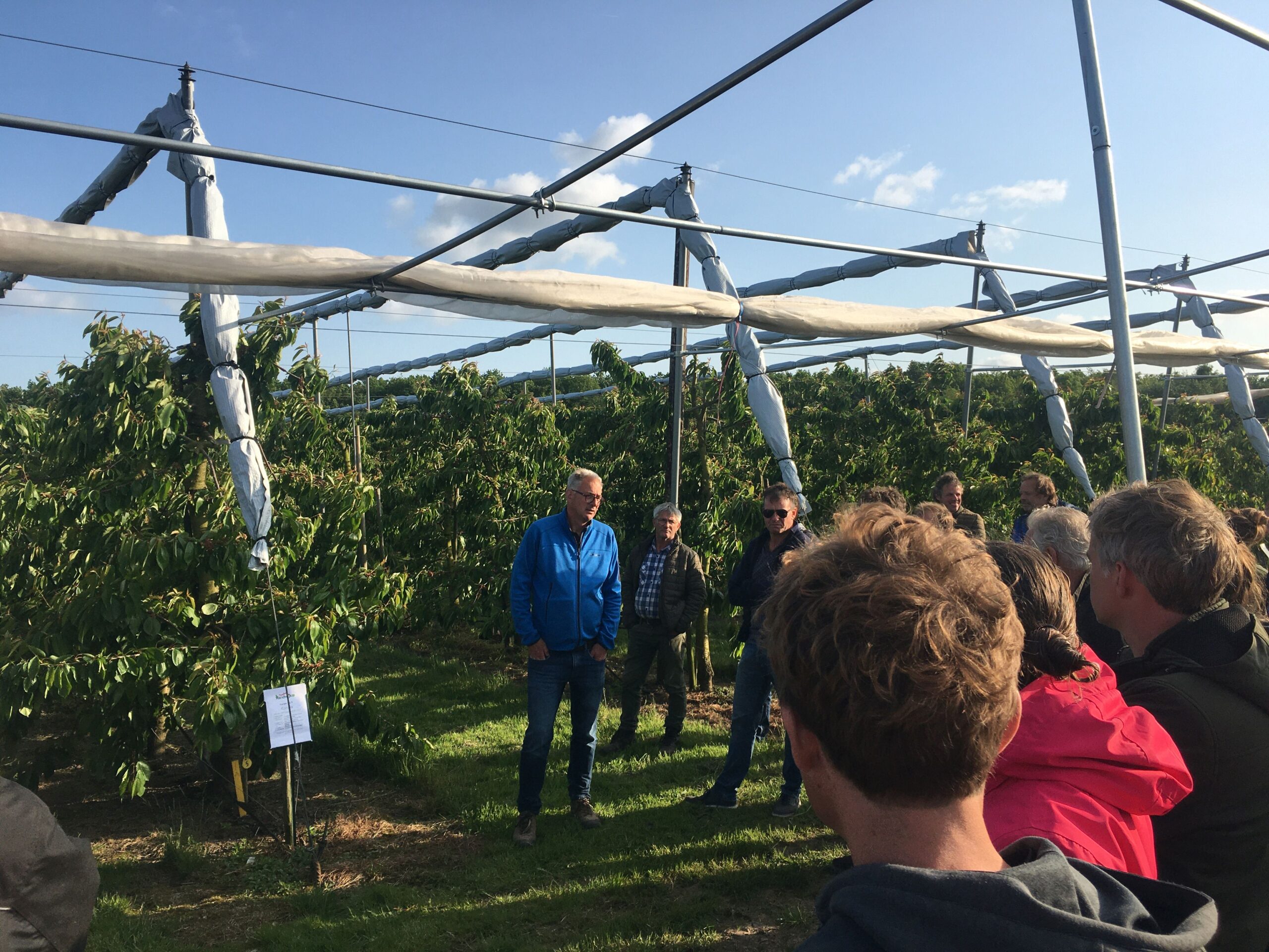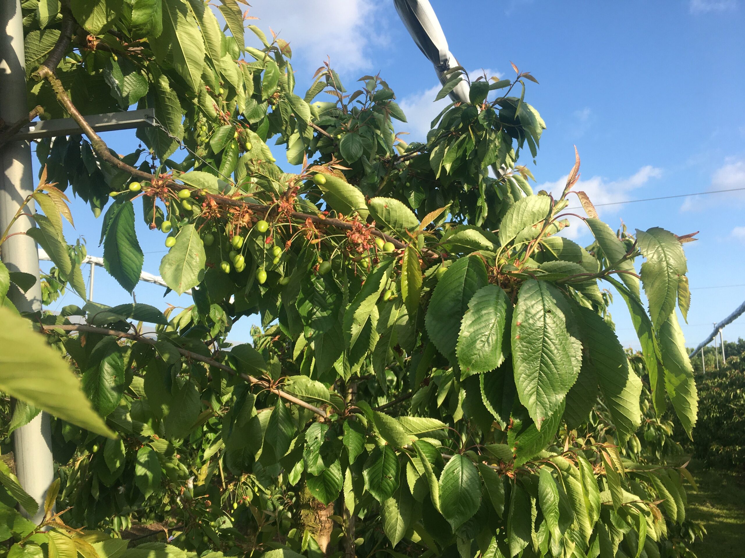 Nachtvorsten en koude bloeiomstandigheden hebben ervoor gezorgd dat de kersenoogst dit jaar op veel plaatsen niet meevalt. Dat was het algemene beeld dat Jan Peeters schetste tijdens de rondgang voor supporters op Proeftuin Randwijk op 23 mei. “Het algemene beeld is dat veel rassen redelijk tot goed gezet zijn. Behalve juist de grote rassen Kordia en Merchant”, vertelde Peeters. “Met name in het midden en oosten van het land is heel veel verloren gegaan door de nachtvorst van 28 maart. De bloemen waren net aan het zwellen en we dachten eigenlijk ‘het moet net kunnen’. Er zijn veel percelen waar tot op een hoogte van zo’n 2 meter geen oogst hangt. Op 4 en 5 april en ook daarna volgden nog enkele nachtvorstje die tot stevig pseudomonas hebben geleid.”