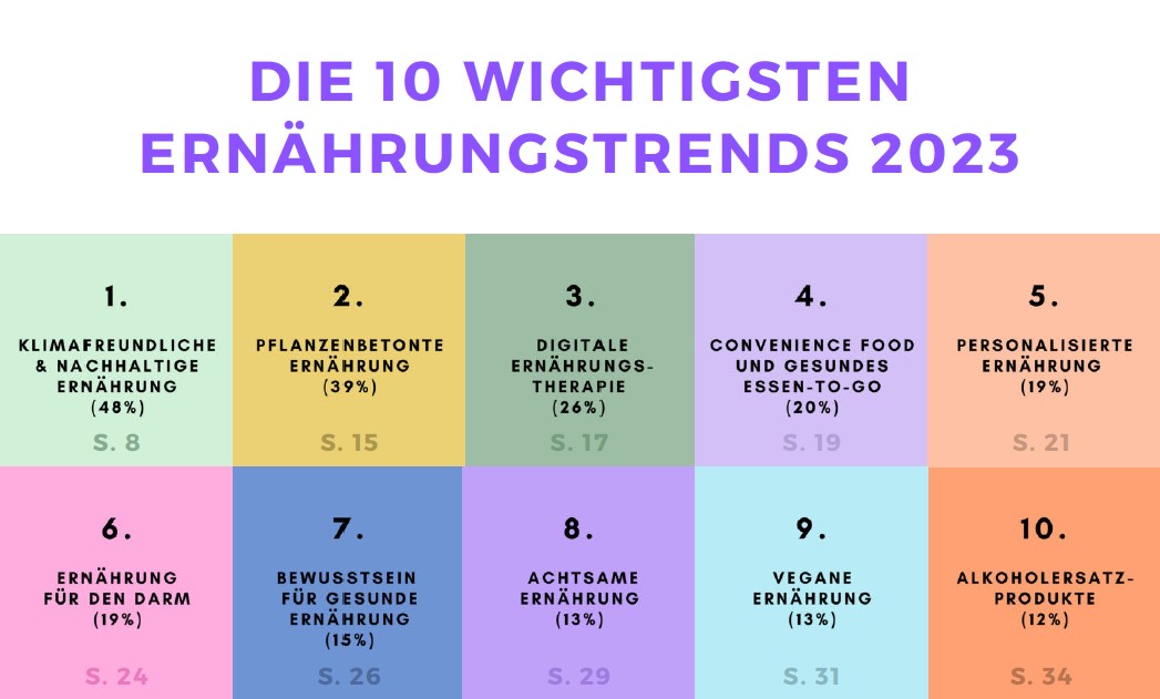 De vraag naar plantaardige producten, regionaal geproduceerd voedsel, transparantie van de waardeketen, en traceerbaarheid van de ingrediënten zal in 2023 verder doorzetten. Een panel van 170 Duitse voedingsexperts heeft een ranglijst van de belangrijkste trends op voedingsgebied voor 2023 samengesteld. Klimaatvriendelijk en duurzaam is de belangrijkste trend van dit jaar in ons belangrijkste exportland Duitsland.