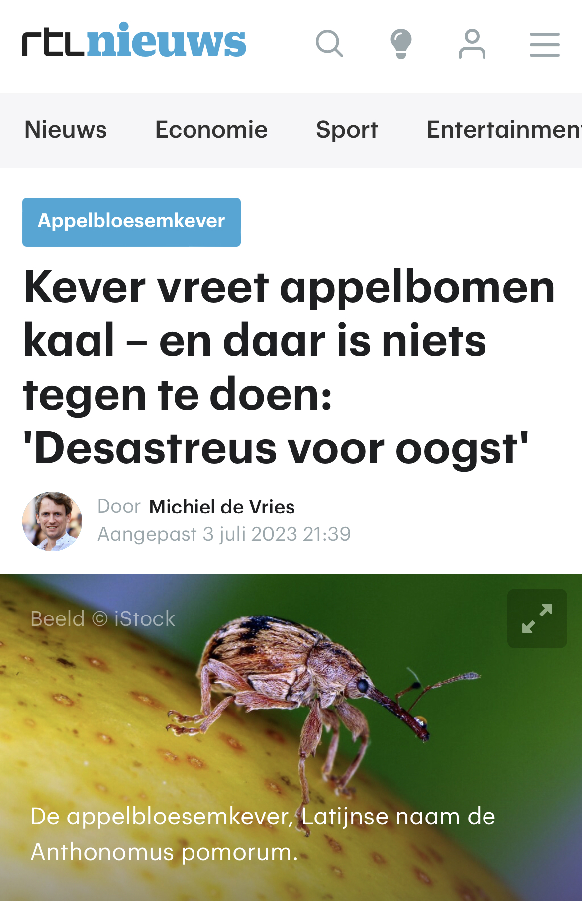 Landelijke en regionale media besteedden de afgelopen dagen volop aandacht aan de problematiek rondom de appelbloesemkever en de noodzaak voor een oplossing. NFO-voorzitter Ron Mulders hoopt dat deze media-aandacht ‘mensen wakker schudt’, zodat sector en overheid uiteindelijk samen tot een oplossing kunnen komen.