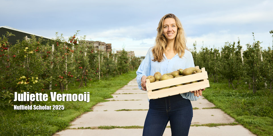 Juliette groeide op op het ouderlijk bedrijf – Fruitbedrijf Toon Vernooij – in Cothen, maar koos in eerste instantie voor een loopbaan buiten de fruitsector. Na haar studie in Amsterdam en Utrecht werkte ze een aantal jaren als consultant. “Ik hielp bedrijven onder andere met strategiebepaling en procesoptimalisatie; hoe kan je bedrijven beter maken en leuker voor de mensen er omheen. Sinds anderhalf jaar ben ik weer terug op het bedrijf thuis, waar we ons richten op de verkoop via korte ketens, op een duurzame manier proberen te telen (denkend aan bodem, water en luchtkwaliteit) en een natuurlijke balans zoeken wat betreft insecten. Nu ik een heel seizoen heb meegedraaid en ik het bedrijf en de mensen goed ken, leek het mij een goed moment om me voor Nuffield in te schrijven”, vertelt Juliette.