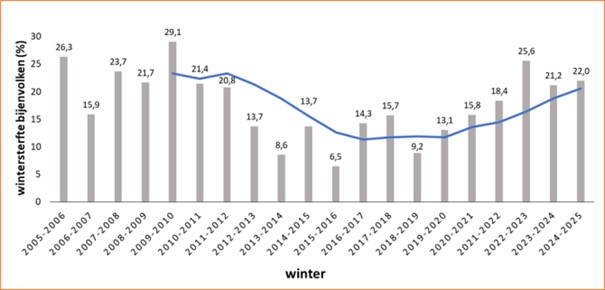 Meer dan de helft van de imkers (55%) gaf aan dat al hun volken de winter hebben overleefd. Bij 7,3% van de imkers was sprake van een volledig verlies van de bijenstand. De oorzaken van wintersterfte zijn divers en kunnen per jaar en locatie variëren. Zo is het verlies van de koningin tijdens de winter vrijwel altijd fataal voor het volk. Ook combinaties van factoren – zoals een gebrek aan voedsel, ziektes en verzwakking voor de winter – dragen bij aan hogere sterfte. De mijt Varroa destructor en verschillende bijenvirussen blijven grote bedreigingen voor de bijengezondheid. Het bestrijden van Varroa destructor is van groot belang om het volk in goede gezondheid de winter te laten overleven. Gegevens uit de enquête tonen aan dat 84,6% van de bijenhouders de mijt in de afgelopen winter heeft bestreden.Overzicht van de gemeten wintersterfte over de periode 2005 tot en met 2024. De blauwe lijn geeft het vijfjarig gemiddelde weer op basis van voorgaande jaren.