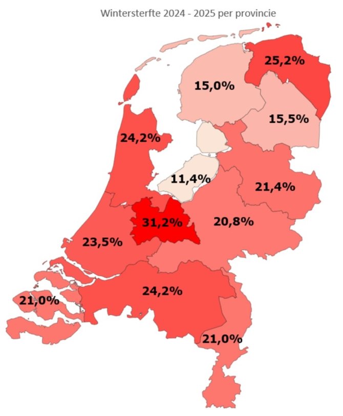 In de winter van 2024/’25 is 22% van de Nederlandse honingbijenvolken gestorven. Voor het derde jaar op rij is de wintersterfte daarmee gemiddeld hoger dan 20%. Regionaal zijn er echter grote verschillen. De precieze oorzaak hiervan is niet bekend, maar mogelijk speelt de variatie in imkerpraktijken een rol.