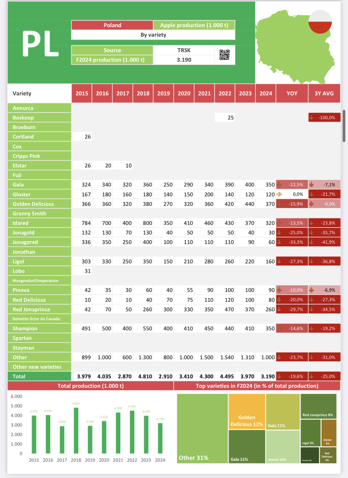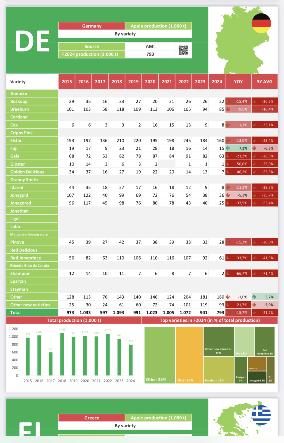De 2024-oogst wordt volgens de prognoses de op één na kleinste oogst van de afgelopen tien jaar. Helwig Schwartau van AMI liet tijdens Prognosfruit weten dat dit alles te maken heeft met vorst- en hagelschade en slecht weer tijdens de bloei. Onder meer Oost-Europese landen zijn hierdoor geraakt. Zo wordt in Polen een bijna 20% lagere oogst verwacht, in Roemenië zal waarschijnlijk 15% minder geoogst kunnen worden en in Hongarije is sprake van een daling van 40% ten opzichte van vorig jaar. Maar ook in België, Oostenrijk en Duitsland (met name het oosten) hebben extreme weersinvloeden geresulteerd in lagere producties.
