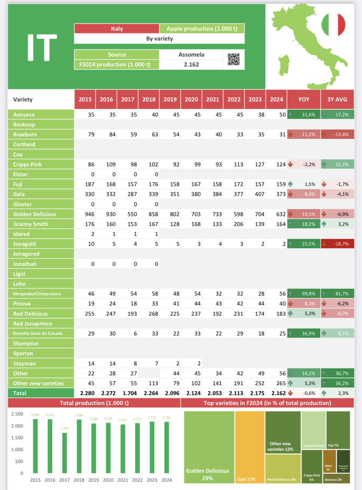 Golden Delicious blijft – met een geschatte productie van 1.972 .000 ton – het grootste ras in de EU. De oogst van dit ras zal naar verwachting 10% lager uitvallen dan vorig jaar.