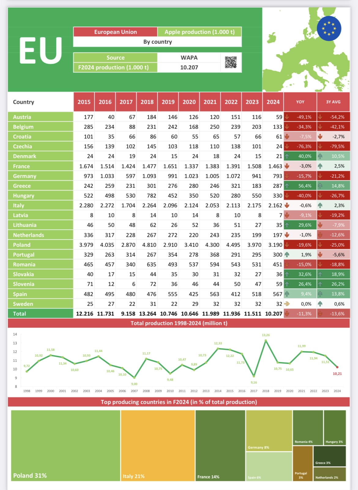 De Europese appeloogst valt dit jaar laag uit, zo maakte de WAPA bekend tijdens Prognosfruit 2024 in Boedapest. Naar verwachting kan 10.210.000 ton appels worden geplukt; dit is ruim 11% minder dan vorig jaar. Sinds 2017 kwam de appeloogst in Europa niet zo laag uit. De uitgangsposities per land verschillen sterk, als gevolg van extreem weer in diverse delen van Europa. Het feit dat de Nederlandse appeloogst op een normaal niveau ligt, biedt goede perspectieven voor komend seizoen.