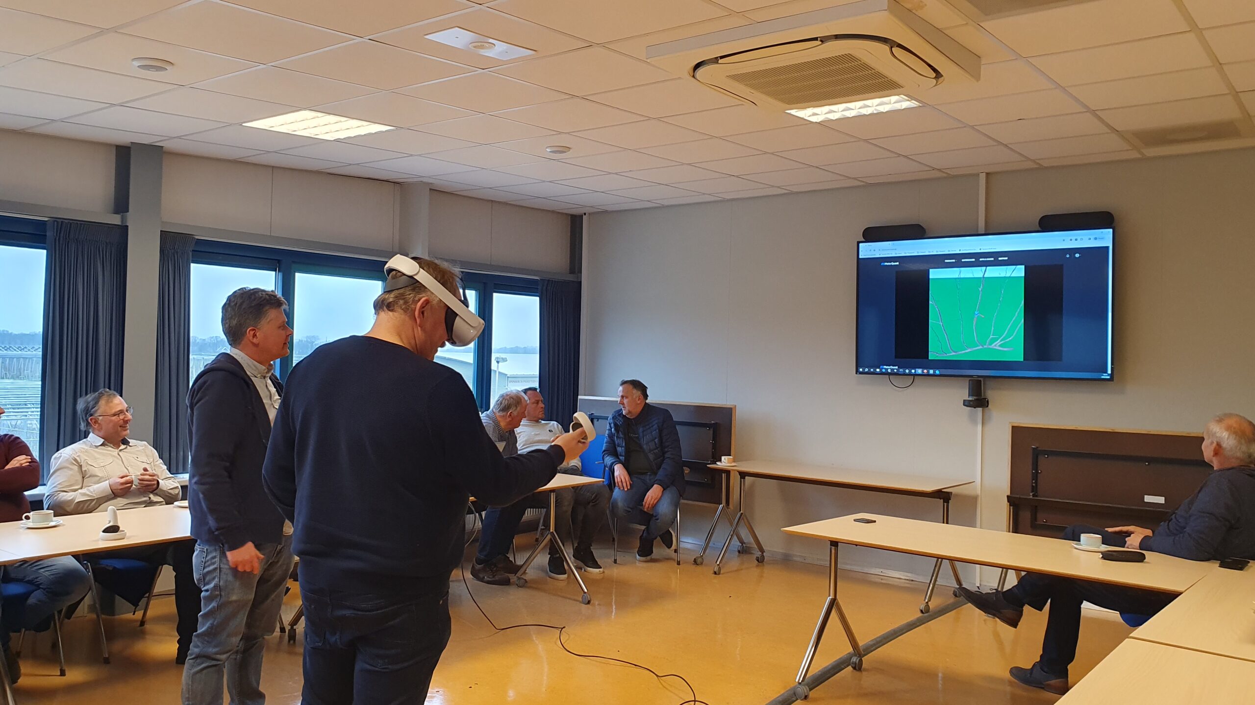 We horen en lezen steeds vaker wat er allemaal mogelijk is met virtual reality. Maar wat is virtual reality precies? En, wat kun je ermee in de boomgaard? Bas Boom liet zien hoe je met het toepassen van een VR-bril medewerkers eenvoudig kunt leren snoeien. De aanwezige telers mochten dit ook even proberen waarbij op een scherm te zien was of de teler de juiste tak afknipte. Het verliep nog wat onwennig, maar het maakte wel duidelijk wat je allemaal kunt doen en leren in een virtuele boomgaard.