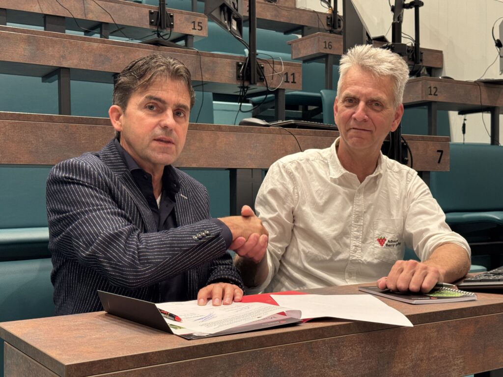 Veilingdirecteur Gerard van den Anker en Nico de Groot, Sales Manager van Advanced Berry Breeding ondertekenen het contract. Foto: ABB
