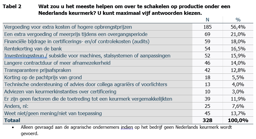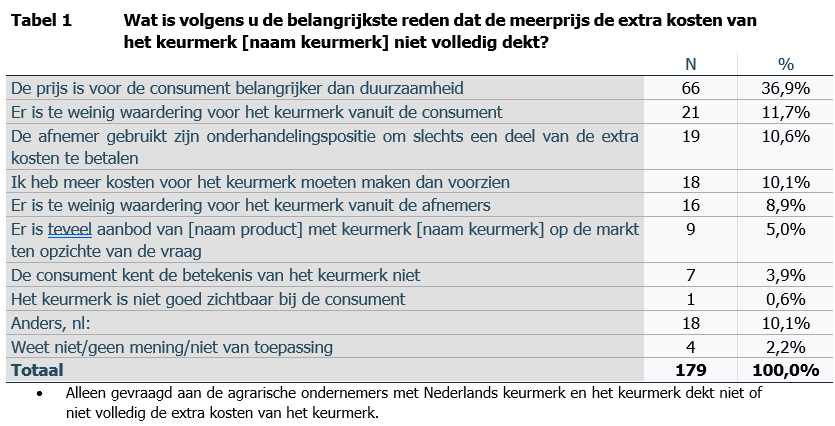De belangrijkste reden dat een meerprijs de extra kosten voor een keurmerk nu nog niet dekt is volgens ruim één op de drie deelnemers aan de vragenlijst dat consumenten prijs belangrijker vinden dan duurzaamheid. Ook zouden afnemers hun onderhandelingspositie gebruiken om slechts een klein deel van de extra kosten te betalen.