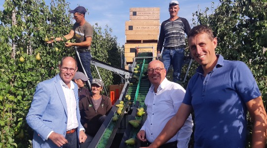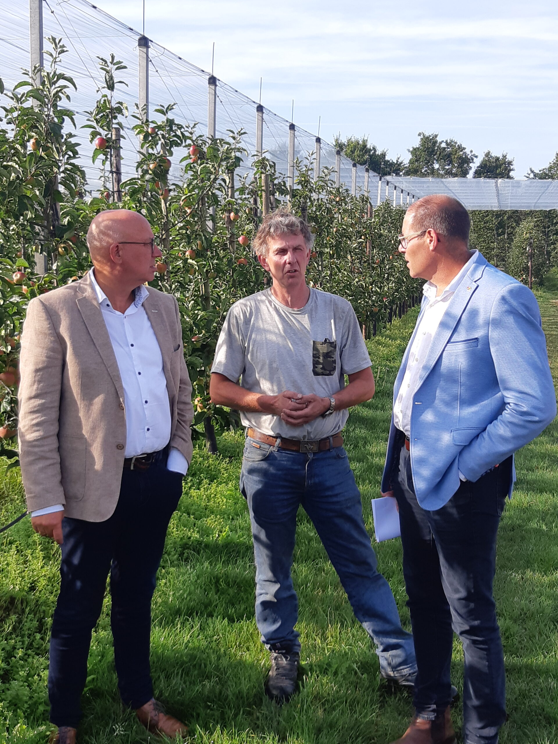 De Zeeuwse landbouwgedeputeerde Arno Vael bracht vanochtend, op uitnodiging van de NFO, een bezoek aan twee fruitteeltbedrijven in Zeeland. Hij werd rondgeleid door NFO-directeur Siep Koning en Tom van der Meer, voorzitter van de NFO Kring Zuid-West. Als eerste werd de maatschap Mesu in Nieuw- en Sint Joosland aangedaan, daarna werd de maatschap Steijn-Bal in Kwadendamme bezocht. De NFO vroeg hierbij met name aandacht voor de thema’s huisvesting arbeidsmigranten en huisvestingsnormen en het belang van short stay. Ook de beschikbaarheid van zoet water en faunaschade waren belangrijke aandachtspunten. “We hebben aangegeven dat een eigen risico van 40 procent bij faunaschade onacceptabel is”, vertelt Siep Koning. “Daarnaast hebben we het belang van innovatie voor de fruitteelt benadrukt. En deze dient bij voorkeur gebundeld plaats te vinden. Maar ondersteuning van bedrijfsspecifieke investeringen is wel belangrijk om de innovatie binnen de sector te versnellen.”